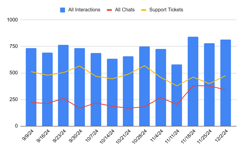 Below you’ll see a chart of tickets and chat interactions with The Events Calendar. This was during our roll-out phase. When Docsbot lived on just nine pages of the Event Calendar website, interactions were steady but limited. Once we expanded it to more than 300 pages, and later embedded it directly inside the plugin, total engagement rose by over 20%. The blue “All Interactions” bars in our internal reporting climbed week over week, while the yellow “Support Tickets” line stayed mostly flat. Even the red “All Chats” line spiked once users could access the bot in-product. That shift showed the real impact of accessibility: AI didn’t make support disappear—it made help available earlier, to more people, without overwhelming our team.